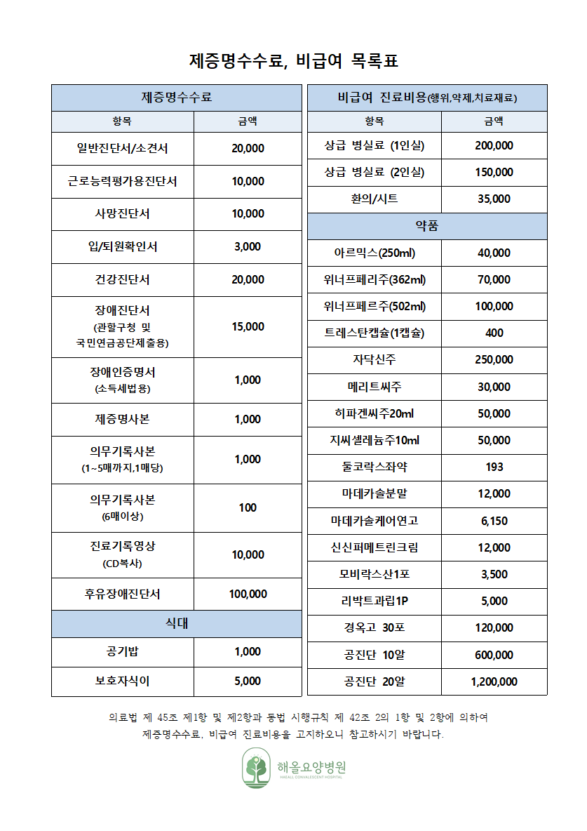 해올요양병원 제증명수수료, 비급여 진료비용 고시